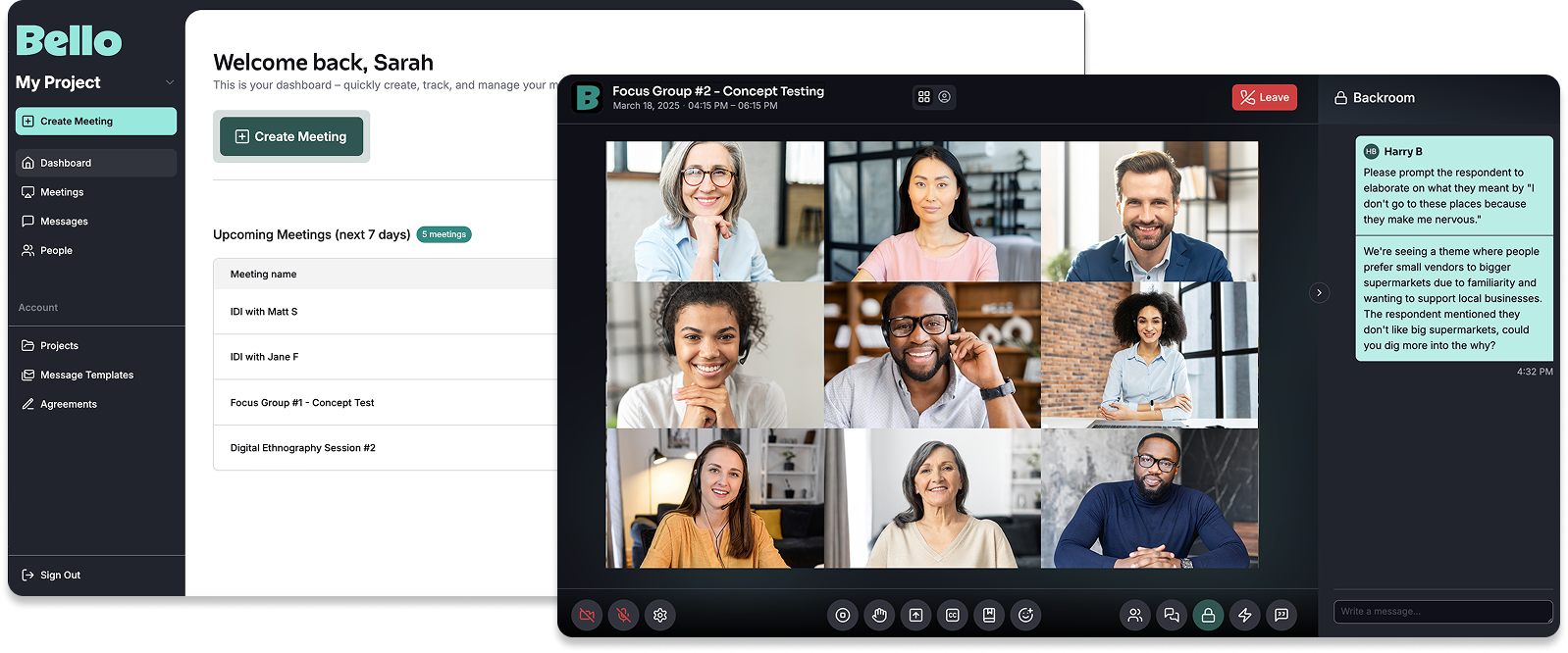 This idea gave rise to Bello, a complete home for online qual where live video sessions, self-guided tasks and diaries, and asynchronous discussions coexist seamlessly.